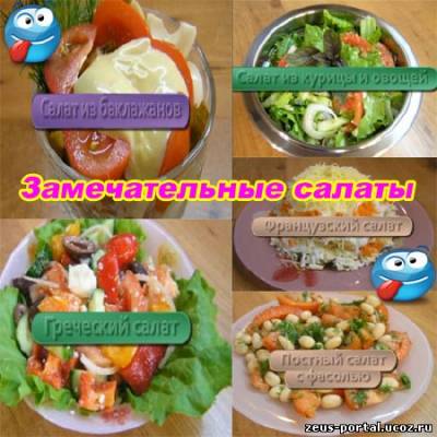 В архиве: - Греческий салат; - Салат из курицы и овощей; - Французкий салат; - Постный салат с фасолью; - Салат из баклажанов